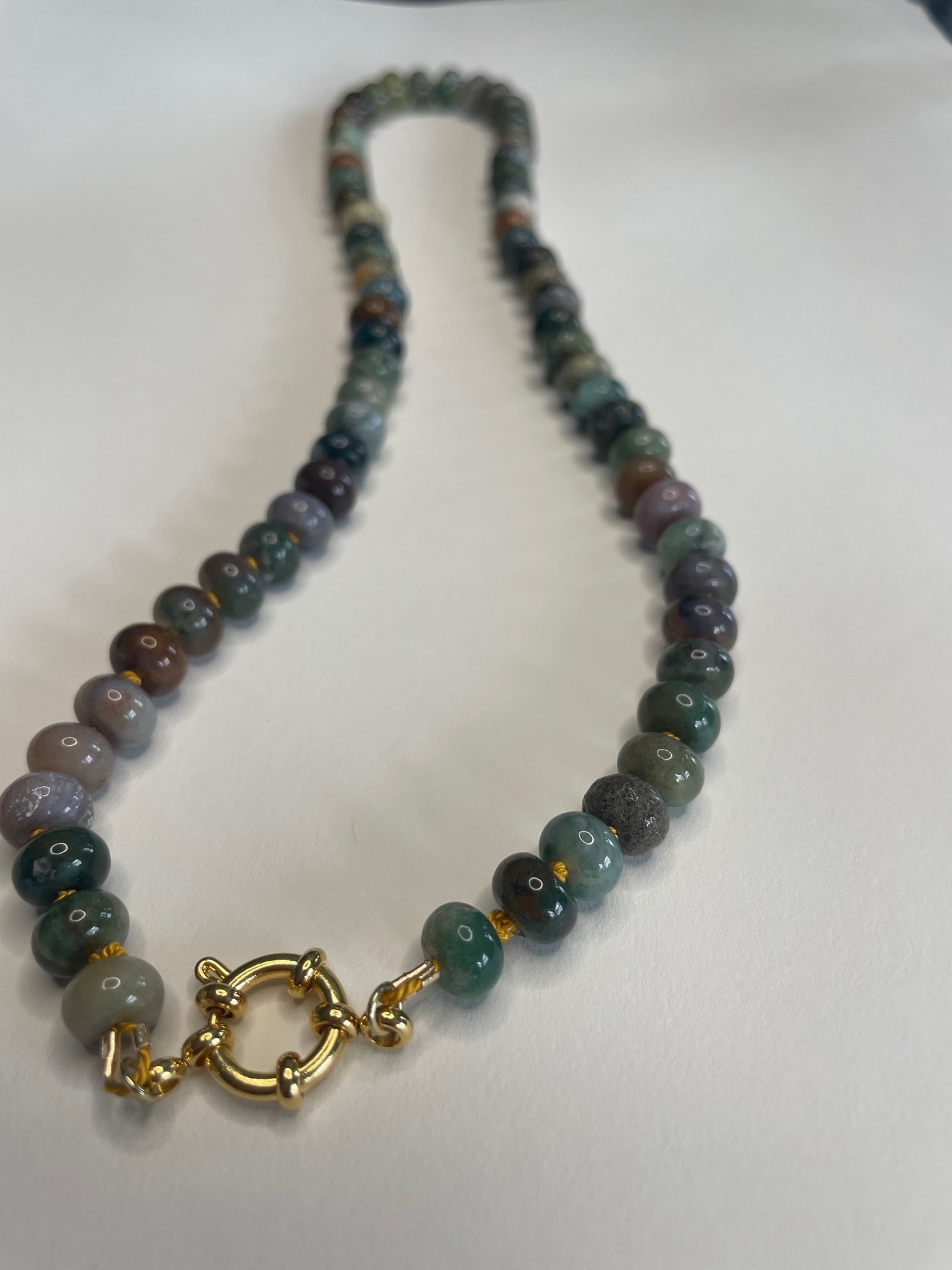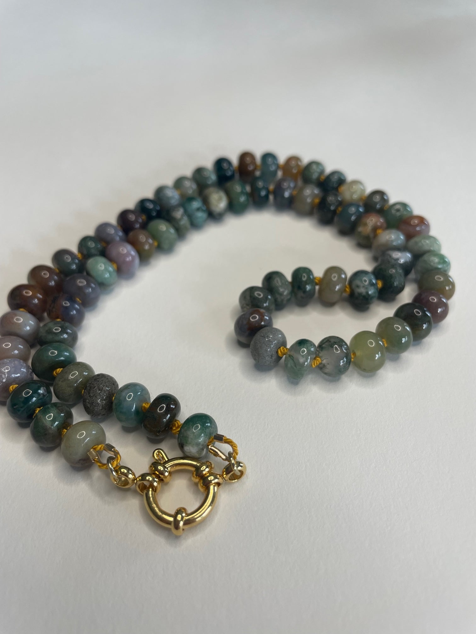 This hand knotted necklace is neutral while also being mystical, grounding, and fresh — like the deep canopy of a forest. Featuring a hand-selected mix of semi-precious stones and finished with a polished gold clasp, this piece brings a natural, effortless beauty to any look.