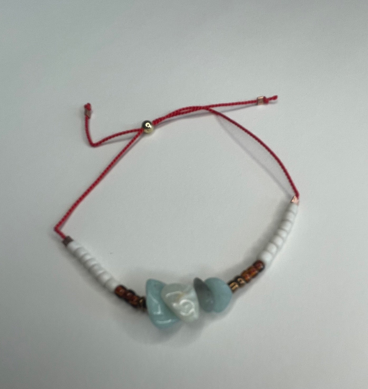 This bracelet is light, flowing, and organic, the amazonite stones sit between earth tone seed beads, strung on a bright red adjustable cord for just the right fit.